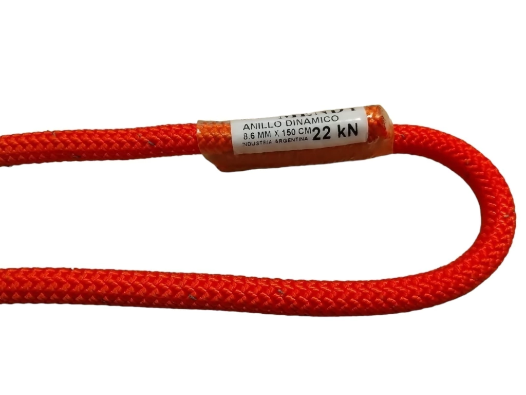 Anillo confeccionado con cuerda dinámica de 8,6 milímetros y costura industrial de poliamida con proteccion plastica termocontraible de 22 kN de resistencia a la rotura.