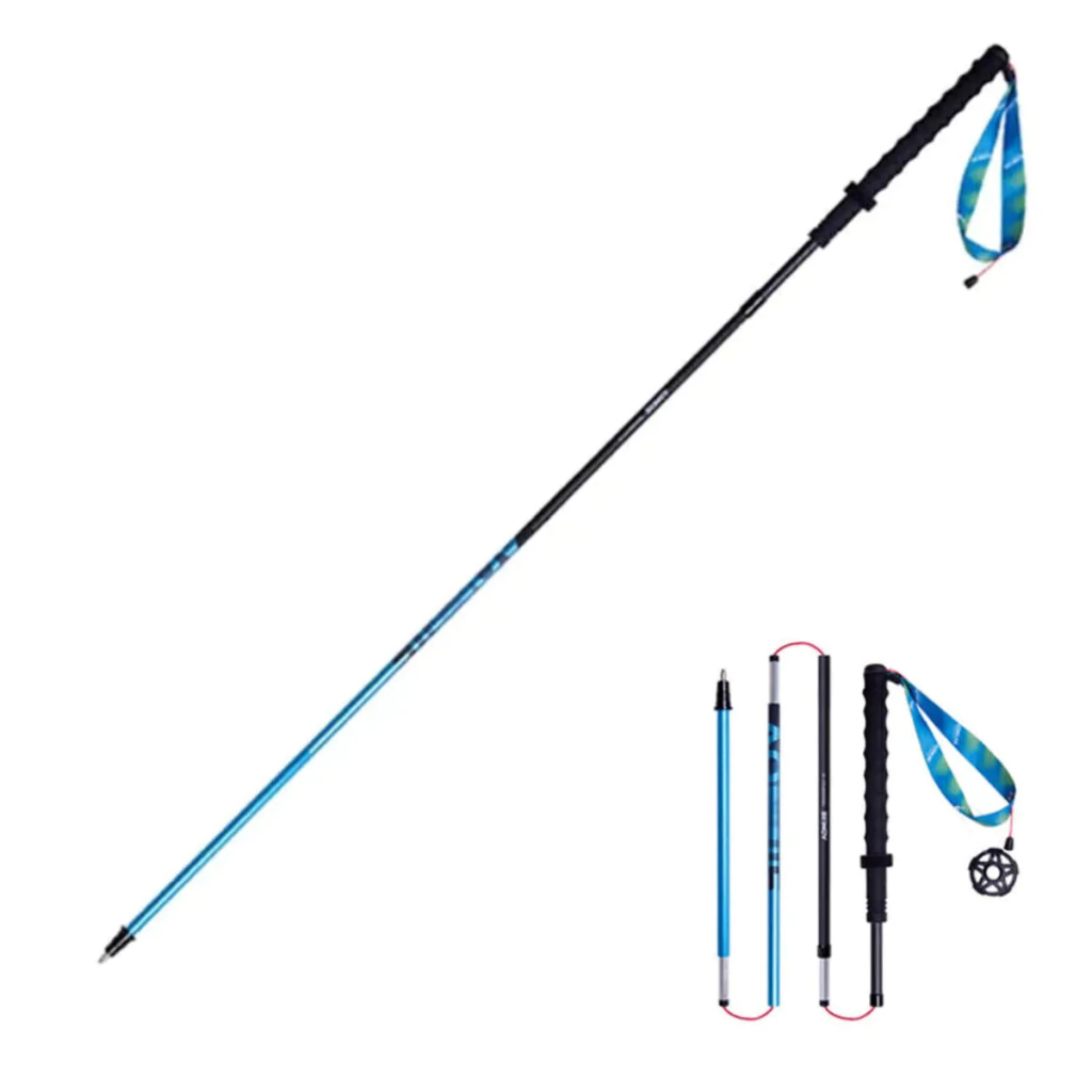 Bastón construido en carbono y aluminio ultraliviano 7075, plegable en cuatro tramos, con un peso de 142 gramos cada bastón. Ligereza máxima para corredores, tanto si los llevan en las manos como si cargan con ellos en la mochila. Cable interno de Dyneema, material muy resistente. Sistema de montaje mediante bloqueo, más fiable y seguro. Roseta desmontable. Medida 110cm. Color: azul.
