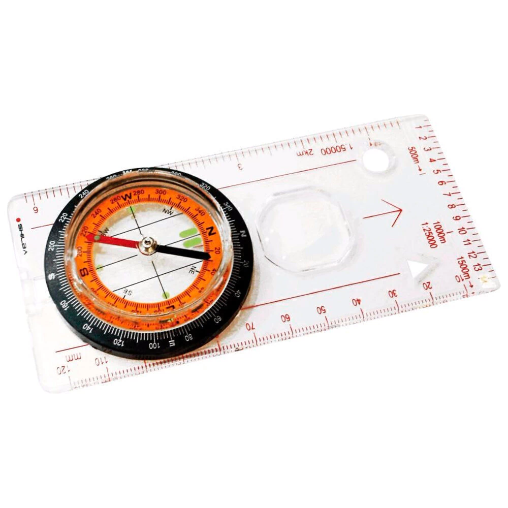 Brújula de placa Shilba DC 455C pensada para utilizarla con un mapa, de ahí que su base sea transparente. Trae una serie de líneas de ayuda impresa y escalas en los bordes. Incluye un inclinómetro y una lupa de lectura.